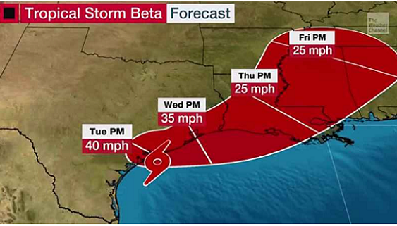 Beta remains a tropical storm and is moving slowly just inland from the middle Texas coast. NOAA's Weather Prediction Center has issued a high risk of excessive rainfall and flooding for Tuesday on the upper Texas coast, including Houston. There could be localized rainfall totals of 3 to 5 inches farther inland from the coast as far north and east as the Arkansas, Louisiana, Texas Region and the lower Mississippi Valley through the end of the week. Flash flood watches have been issued by the National Weather Service from the middle Texas coast to southeast Louisiana, including Houston, Lake Charles and New Orleans. Tropical-storm-force wind gusts (39 mph or greater) could continue today in the tropical storm warning area, from Port Aransas, Texas, to Sabine Pass, Texas. The strongest winds will be in the offshore waters.