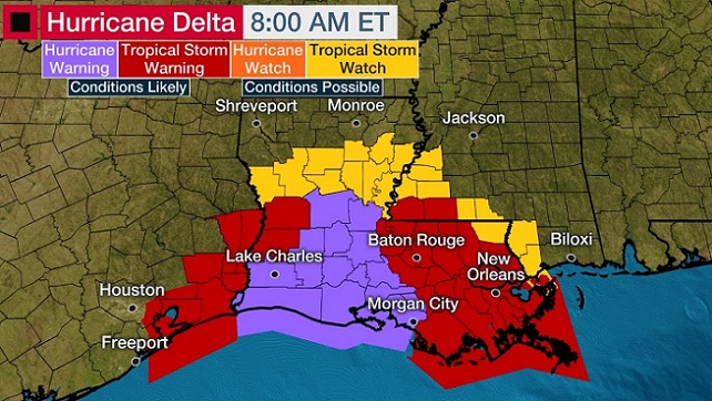 Hurricane Delta has strengthened back into a Category 2 as it heads for a Friday landfall on the Gulf Coast with storm surge flooding, damaging winds and rainfall flooding from Louisiana and east Texas to Mississippi. A hurricane warning is in effect from east of Sabine Pass, Texas, to Morgan City, Louisiana, including Lake Charles and Lafayette in Louisiana. A storm surge warning is also in effect from Sabine Pass, Texas, to Ocean Springs, Mississippi, including Calcasieu Lake, Vermilion Bay, Lake Pontchartrain, Lake Maurepas and Lake Borgne.