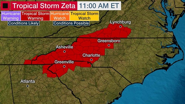 Zeta's strong winds are ongoing in the Southeast. Damaging wind gusts are possible near and to the east of where Zeta tracks today. Winds gusted over 50 mph in some parts of northern Georgia and upstate South Carolina this morning. Widespread power outages have been reported along the path of Zeta in the South. A tropical storm warning remains in effect from northern Georgia to Virginia, where tropical storm conditions are expected today.