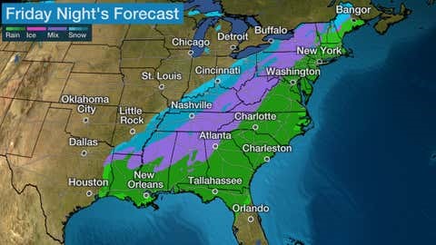 As colder air is drawn into the strengthening storm Friday night, rain will change to snow in parts of the Ohio and Tennessee valleys as far south as northern Mississippi, northern Alabama and northern Georgia. This could lead to slick roads even without significant snow accumulations in parts of the Tennessee Valley. Colder air crashing behind the storm could cause icy spots on roads as temperatures fall below freezing into Saturday morning.