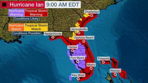 Hurricane Ian is nearing southwest Florida as one of its most intense hurricanes on record, expected to produce catastrophic storm surge, destructive winds and flooding rainfall. Hurricane warnings (shaded in purple in the map are in effect for parts of Florida's West Coast and some degree inland, including Tampa-St. Petersburg, Fort Myers and Orlando. This means hurricane conditions are expected.