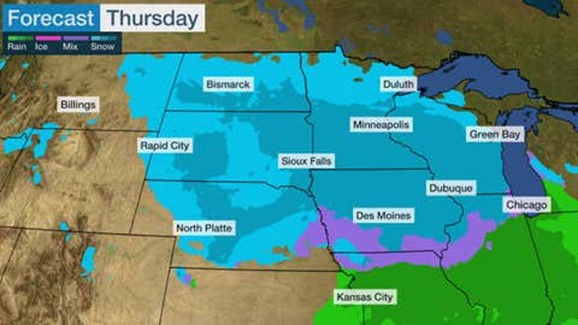 The storm will intensify, which means moderate to locally heavy snow is expected in the Northern Plains and upper Midwest, including in Minneapolis-St. Paul, Rapid City, South Dakota; and Des Moines, Iowa.