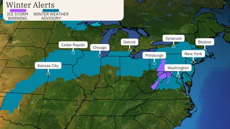 Winter weather advisories have been issued for large parts of the Midwest, Appalachians, mid-Atlantic and Northeast, including Baltimore, Chicago, New York and Pittsburgh. Difficult travel conditions are possible in these areas.