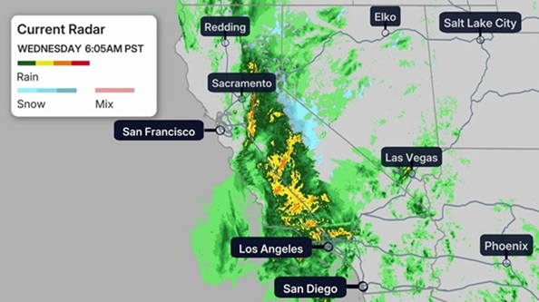 After flooding rain the past few days, a more dangerous flood threat looms for California through Friday. Rainfall is becoming more widespread, and several inches of rain have already fallen as of Wednesday morning. A dramatic increase in rainfall rates and wind gusts is expected by Wednesday morning, along with an increase in snowfall rates in the Sierra.