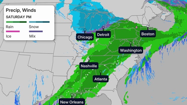 Saturday: Snow is expected in parts of the western Great Lakes and upper Midwest, while more soaking rain spreads into the East as far north as parts of New England and upstate New York. Strong wind gusts are possible in much of the Midwest and East. Thunderstorms will linger in parts of the Southeast and could develop as far north as the mid-Atlantic ahead of the cold front.