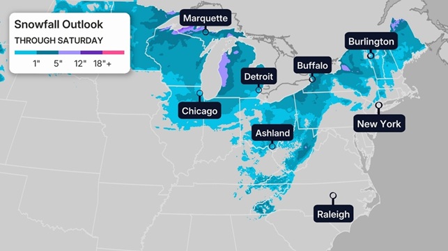 The next round of snow will arrive in the Midwest and Great Lakes on Thursday before pushing eastward. Many of the same areas that see snow from the first system would receive snow from this one, adding to those snow totals. Snow is expected to linger across portions of the Northeast through Sunday.
