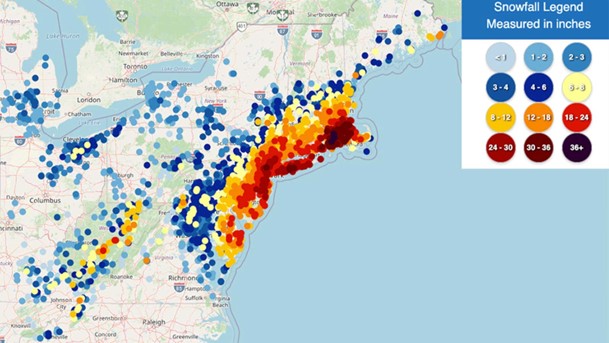 Newark, New Jersey, tallied 27.2 inches of snow, just 0.6 inches shy of their all-time snowstorm record from the January Blizzard of 1996. Atlantic City, New Jersey's 16.9 inches was their heaviest snowstorm in over 15 years, since the post-Christmas 2010 East Coast storm.