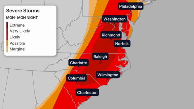 For now, NOAA's Storm Prediction Center has highlighted the area with the highest chance of severe weather from parts of the mid-Atlantic states to the Carolinas.